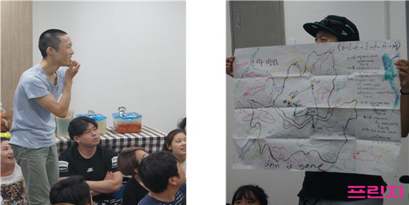 °øµ¿Ã¢ÀÛÁý´Ü ÅöÄ¡´Ù(±è±¹È£): ¿©ÀüÈ÷ ÀÛǰÀ» ¸¸µé°í ÀÖ´Â ´Ü°èÀ̸ç, À̹ø ÁÖ ¾ÈÀ¸·Î ¸¸µå´Â °ÍÀ» ¸ñÇ¥·Î Çϰí ÀÖ½À´Ï´Ù. °øµ¿Ã¢ÀÛÀÌ¶ó¼ °¢ÀÚ°¡ ¸»ÇÒ ¼ö ÀÖ´Â À§Ä¡¸¦ ¼öÆòÀûÀ¸·Î ³õ°í ÀÛ¾÷ÇÏ´Ùº¸´Ï ¹æÇ⼺À» Àâ±â°¡ ¾Æ¹«·¡µµ ½±Áö ¾Ê¾Ò½À´Ï´Ù. ¾ÆÁ÷µµ Á¤È®ÇÏ°Ô Á¤ÇØÁöÁö ¾Ê¾Ò°í ¾î¶»°Ô ¿ì¸®°¡ ¸¸µé¾î°¡´Â °úÁ¤À» °ø¿¬¿¡ ´ã¾Æ³¾ ¼ö ÀÖÀ»±î¿Í °ü°´µéÀÌ °Å±â¿¡¼ ¾î¶² Àǹ̸¦ ã¾Æ³¾ ¼ö ÀÖÀ»±î¿¡ ´ëÇÑ µµÀüÀ» °è¼ÓÇϰí ÀÖ½À´Ï´Ù.