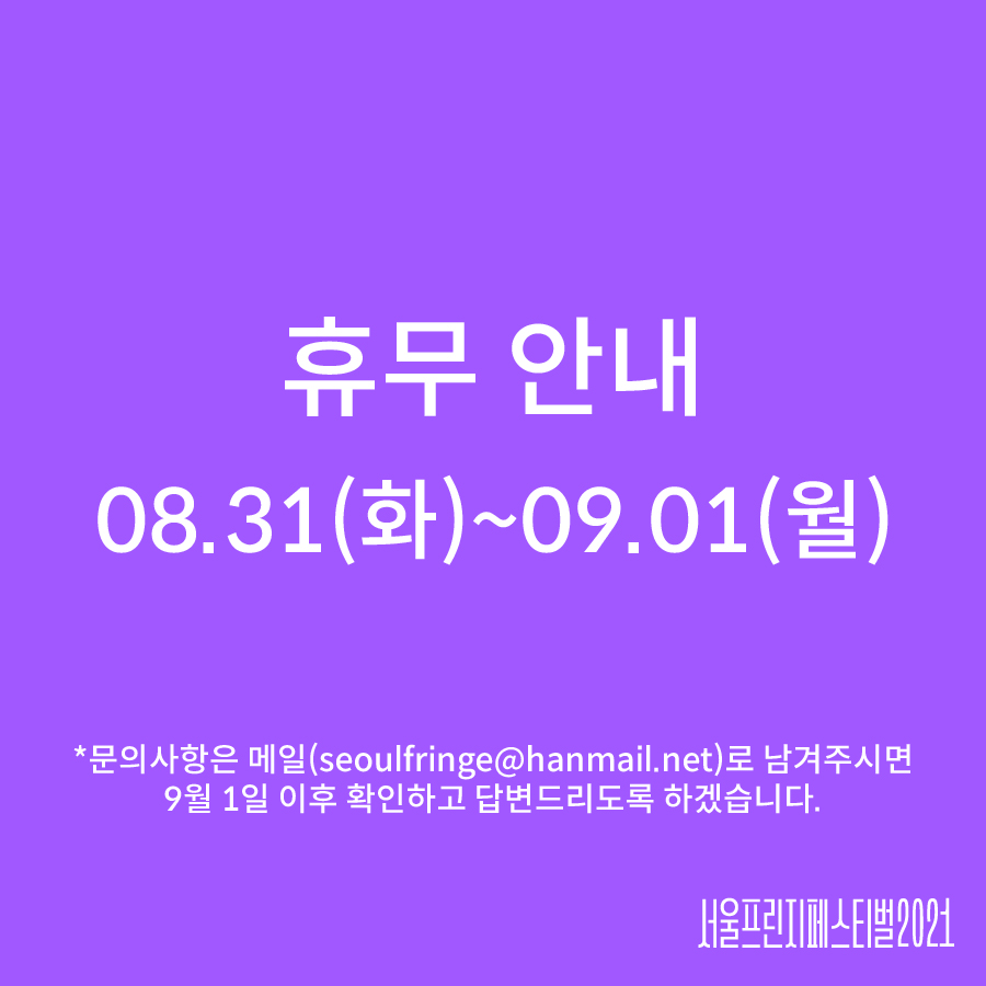 8¿ù 31ÀϺÎÅÍ 9¿ù 1ÀϱîÁö ¼¿ïÇÁ¸°Áö³×Æ®¿öÅ©¿Í ÇÁ¸°ÁöÆä½ºÆ¼¹ú »ç¹«±¹Àº ÈÞ¹«±â°£À¸·Î, ¹®ÀÇ»çÇ×Àº ¸ÞÀÏ(seoulfringe@hanmail.net)·Î ³²°ÜÁֽøé 9¿ù 1ÀÏ ÀÌÈÄ È®ÀÎÇÏ°í ´äº¯µå¸®µµ·Ï ÇϰڽÀ´Ï´Ù.