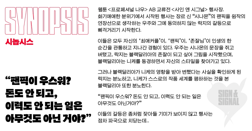 ÇÁ¸°Áö¸¦ ÅëÇØ ¾î¶² ÀÛǰÀ» °ø°³ÇÏ·Á°í Çϳª¿ä?¿¬±Ø ¡¶»çÀÎ ¾Ø ½Ã±×³Î¡·Àº ¿©¼ºµéÀÌ ½º½º·Î¸¦ Ç¥ÇöÇÏ°í ¿¬´ëÇϴ â±¸·Î¼ µ¿Àι®È¿¡ ÁÖ¸ñÇÕ´Ï´Ù. RPS, BL ÆÒ´ý Áß½ÉÀ¸·Î Çü¼ºµÈ ¼Ò±Ô¸ð Çà»çÀÎ ¡®±³·ùÀü¡¯ ¹®È¸¦ ÀçÇöÇÔÀ¸·Î½á ¿©¼º âÀÛ °øµ¿Ã¼ ³»ºÎÀÇ °¥µî°ú À¯´ë¸¦ Á¦½ÃÇÕ´Ï´Ù.