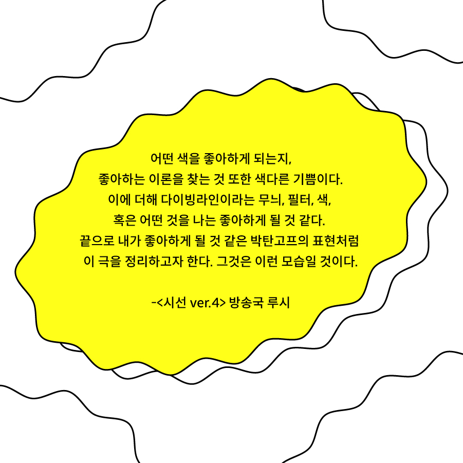 ¸¸ÀÏ ±×°ÍÀÌ ÀÌ·ÐÀ» Á¦½ÃÇÑ ¿¬Ãâ°¡ÀÇ ¶æÀ̶ó°í °¡Á¤ÇÑ´Ù¸é, ´ÙÀ̺ù¶óÀÎÀÇ <½Ã¼± ver 4>´Â ±× ¼± ¸ðµÎ¿¡ ´ÙÀ̺ù¶óÀÎÀ̶ó´Â ¹«´Ì, ÇÊÅÍ, ¶Ç ´Ù¸¥ »ö ȤÀº ¾î¶² °ÍÀ» ´õÇß´Ù. ÀÌÁ¦ °ü°´ÀÇ ´«¿¡´Â ´Ù¸¥ »ö°ú À̾߱Ⱑ µÎ °ã ¾ñ¾îÁø ¾ÈƼ°í³×°¡ º¸ÀÏ Å×Áö¸¸, ±âÁ¸ÀÇ »¡°£»ö ¼±, Áï ¾ÈÆ¼°í³×´Â ´õ¿í °·ÄÇØÁø´Ù. ±×¸®°í °ü°´ Àú¸¶´ÙÀÇ ·»Áî·Î À̾߱â´Â ´õÇØÁú °ÍÀÌ´Ù. ÇϳªÀÇ ¿¬±Ø¿¡ ´õÇØÁö´Â ¼ö¸¹Àº °ÍµéÀ» ÀÌÇØÇÏ¸ç ³ª´Â ¿ì¸®°¡ º¸Áö ¸øÇß´ø ¿¬±ØÀÇ À̸é, ±× ¼ö ¾ø´Â ·¹ÀÌ¾î ±× ÀÚü¸¦ ´À³¤´Ù. ±×¸®°í ±×°Ç ºñ¹ÐÀ» ¾Ë¾Æ³½ °Í °°±âµµ, ¿ì¸®°¡ ÈÍÈ÷ º¸ÀÌÁö¸¸ º¸Áö ¸øÇÑ °ÍÀ» ¾Ë¾Æ³½ °Í °°±âµµ ÇÑ Áñ°Å¿òÀÌ´Ù.